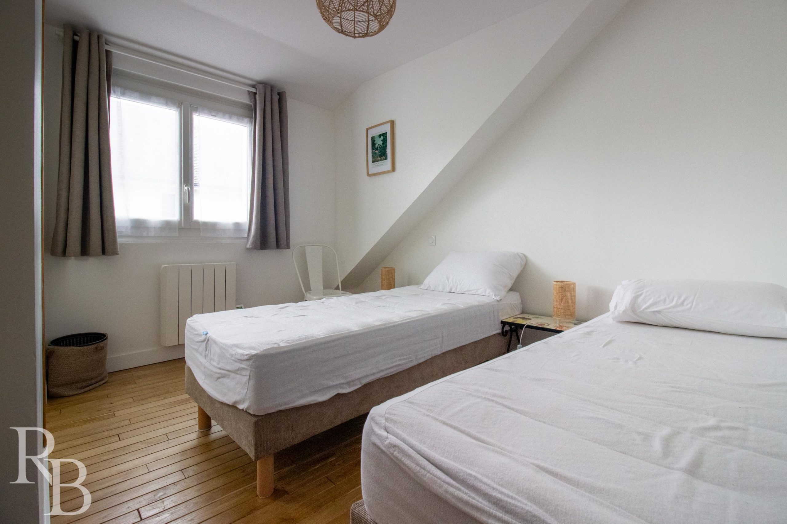 À l’étage, l’espace nuit propose deux chambres avec salles d’eau et wc attenants.
